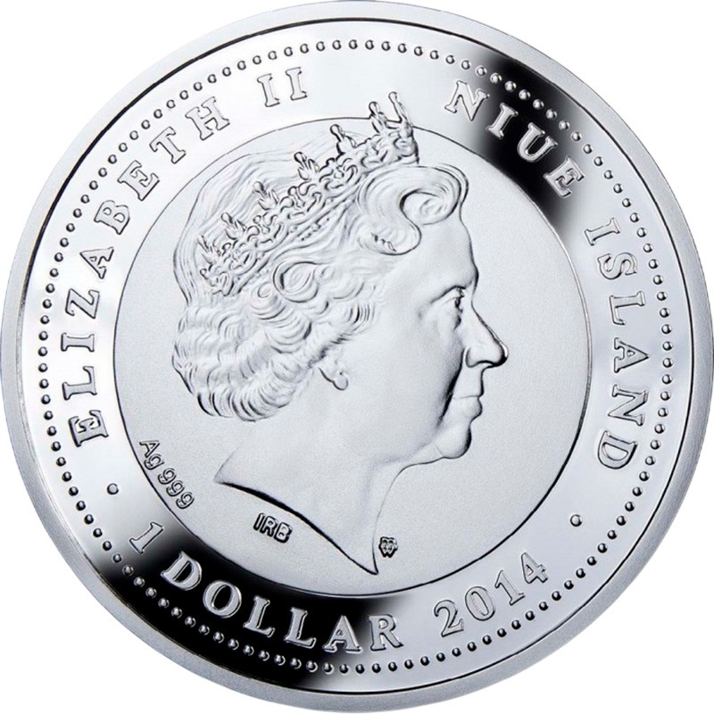 В центре - портрет Ее Величества Королевы Елизаветы II дизайнера Яна Рэнка-Бродли (IRB). Слева внизу – 999 (проба серебра), справа внизу– m/w – монограмма Польского монетного двора. Вдоль канта надписи: ∙ ELIZABETH II  NIUE ISLAND ∙ 1 DOLLAR  2014 ∙ (Елизавета II, страна-эмитент, номинал, год чеканки).