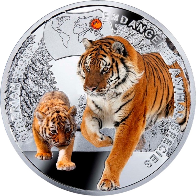 В центре - цветное изображение взрослого тигра с тигренком на фоне заснеженного леса. Вверху - карта мира с оранжевым кристаллом, указывающим на ареал обитания вида. Вдоль канта по кругу надписи: SIBERIAN TIGER  ENDANGERED ANIMAL SPECIES (Амурский тигр, название серии).