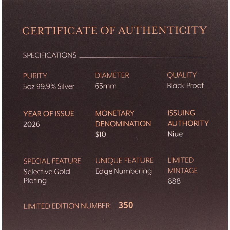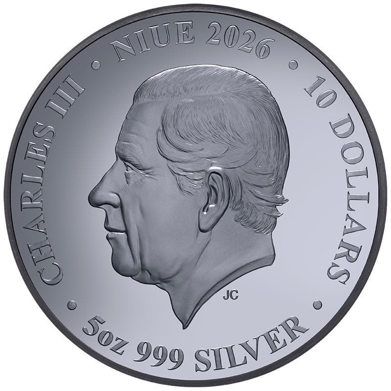 На аверсе изображен Его Величество король Чарльз III. На усечении шеи инициалы дизайнера JC (Jody Clark). Вдоль канта надпись: CHARLES III · NIUE 2026 · 10 DOLLARS · 5oz 999 SILVER · (Чарльз III, страна-эмитент, год чеканки, номинал, вес и проба серебра). На гурте индивидуальный номер монеты.