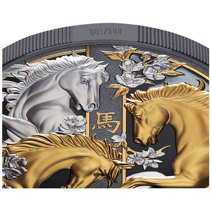 На реверсе изображены три грациозные лошади на фоне цветов и облаков. В центре иероглиф: 馬 (Лошадь).