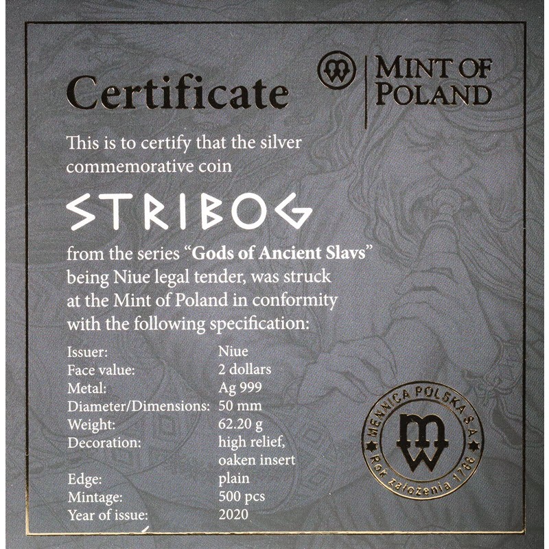 Серебряная монета Ниуэ "Славянские боги. Стрибог" 2020 г.в., 62.2 г чистого серебра (проба 999)