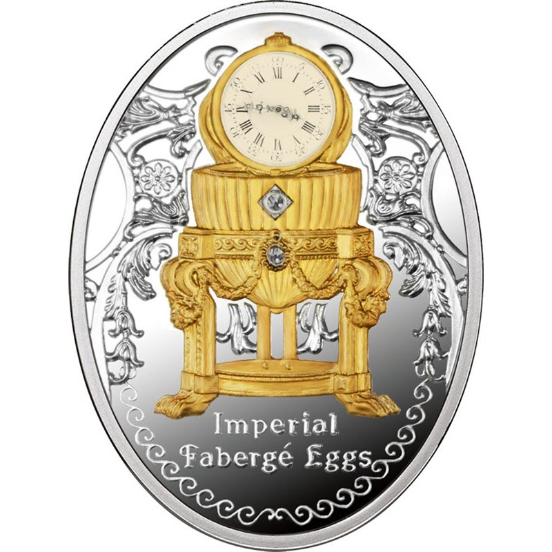 Серебряная монета Ниуэ овальной формы из серии «Императорские яйца Фаберже» размером 67.35 Х 90.00 мм. У нее качество пруф, выборочное золочение и две вставки из кристаллов Swarovski®. Поставляется в элегантном футляре с сертификатом подлинности. Тираж: 99 штук.