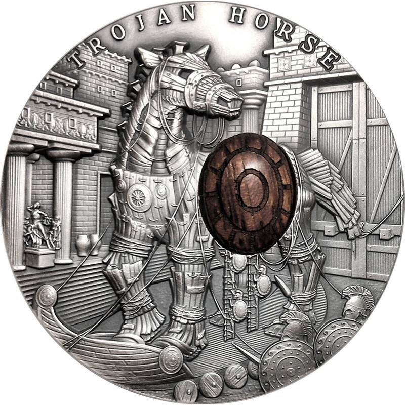Эта удивительная серебряная монета весом в 2 унции – первая из серии «Древние мифы» и посвящена Троянскому коню. У нее качество античной отделки, высокий рельеф и вставка из отполированного дерева. Поставляется в деревянном футляре с сертификатом подлинности. Тираж: 500 штук.