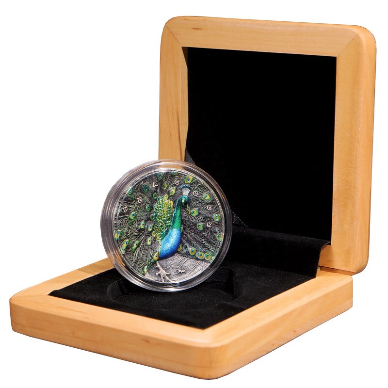 Эта невероятная серебряная монета весом в 3 унции - вторая в новой серии "Удивительные животные", посвященной невероятному миру животных, в этом выпуске: павлин. У монеты качество Antique Finish, покрытие голографической эмалью, высокий рельеф, вставка из кристалла и она поставляется в футляре вместе с сертификатом подлинности. Ограниченный тираж 422 штуки по всему миру!