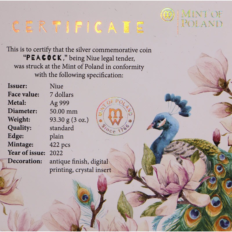 Серебряная монета Ниуэ "Удивительные животные: Павлин" 2022 г.в., 93.3 г чистого серебра (Проба 999)