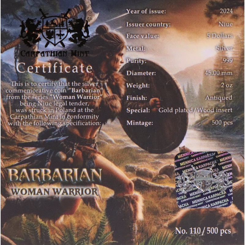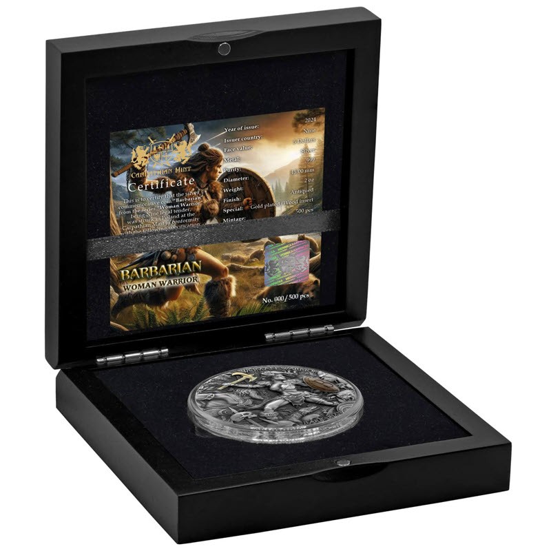 Серебряная монета Ниуэ - пятая из серии «Женщины-воины» - посвящена варварам. У нее качество античной отделки, высокий рельеф, выборочное золочение и вставка из натурального дерева. Поставляется в оригинальном футляре с сертификатом подлинности. Тираж: 500 штук.
