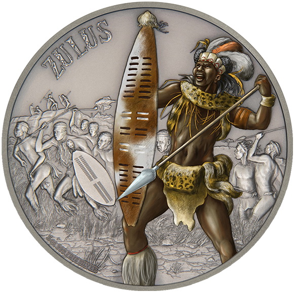 Серебряная монета Ниуэ «Зулусы» 2017 года выпуска посвящена выдающемуся племени и его воину – Чака. Монета из серии «Воины в истории». Она отчеканена в Монетном дворе Новой Зеландии. Ограниченный тираж.
