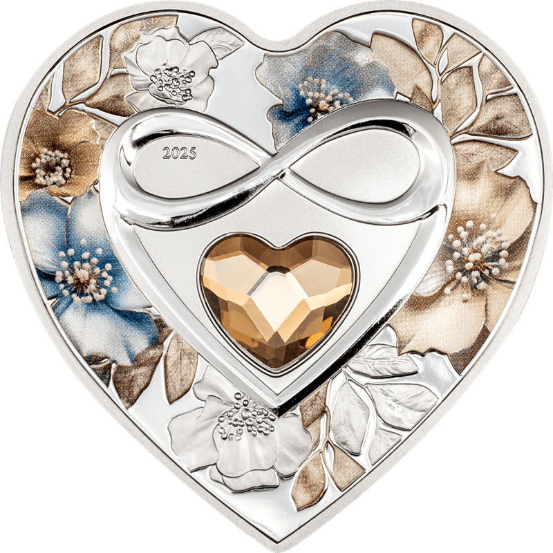 На реверсе вверху в стилизованном сердце изображен знак бесконечности, ниже кристалл в форме сердца. Фоном служат разноцветные цветы. Слева в знаке бесконечности: 2025 (год чеканки).