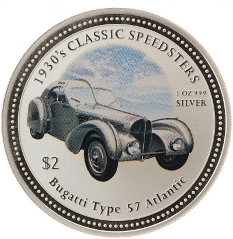 Цветное изображение автомобиля. Слева номинал — 2$, справа вес и чистота металла — 1 oz 999 SILVER.