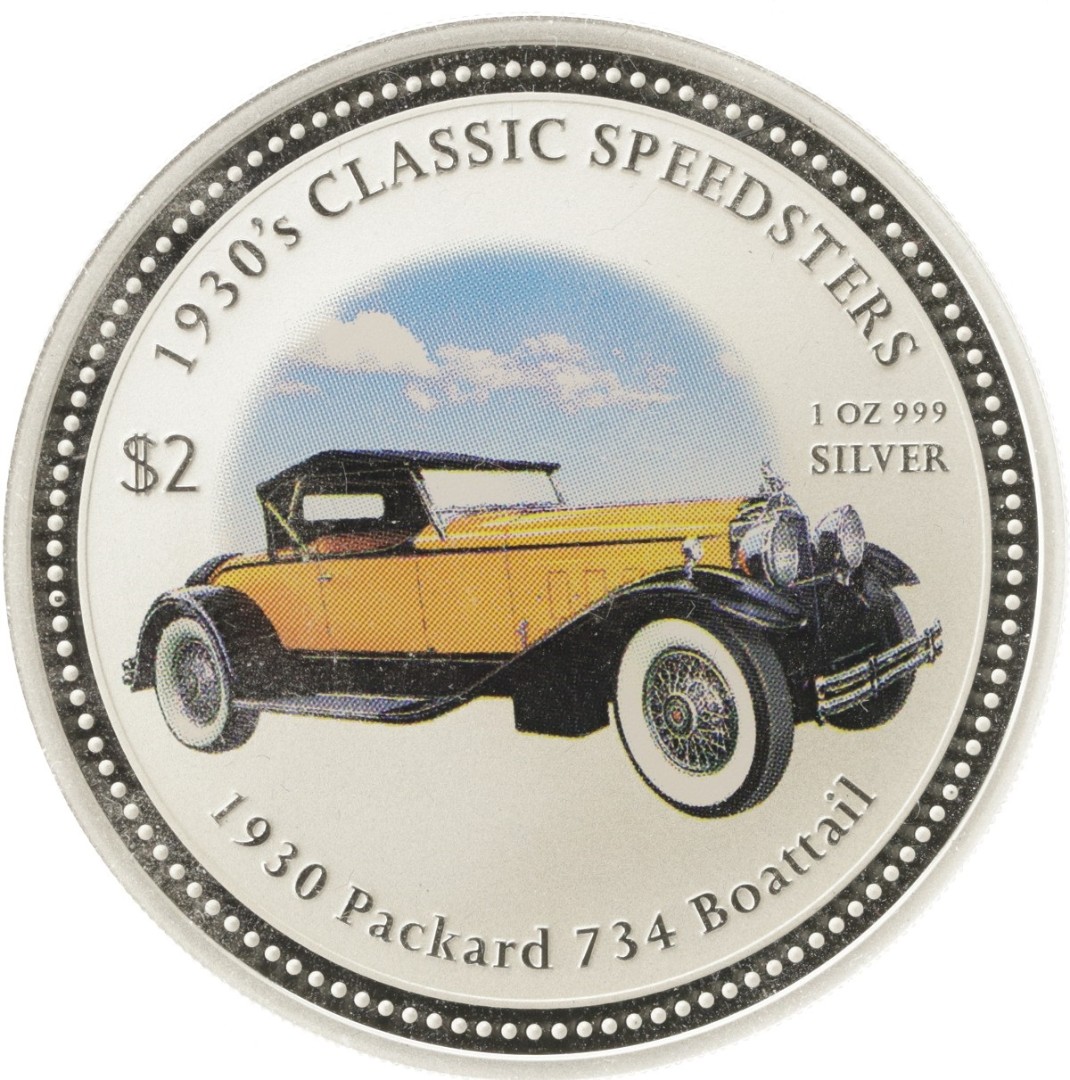 Цветное изображение автомобиля. Слева номинал — 2$, справа вес и чистота металла — 1 oz 999 SILVER.