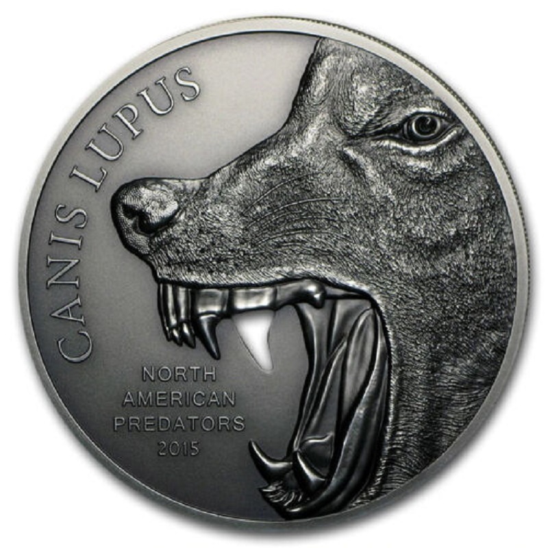 изображен крупный план серого волка с открытой пастью, обнажающей зубы, подчеркнутые керамическим клыком, инкрустированным вручную. По ободу надпись «CANIS LUPUS» и название серии «NORTH AMERICAN PREDATORS» и год выпуска — 2015