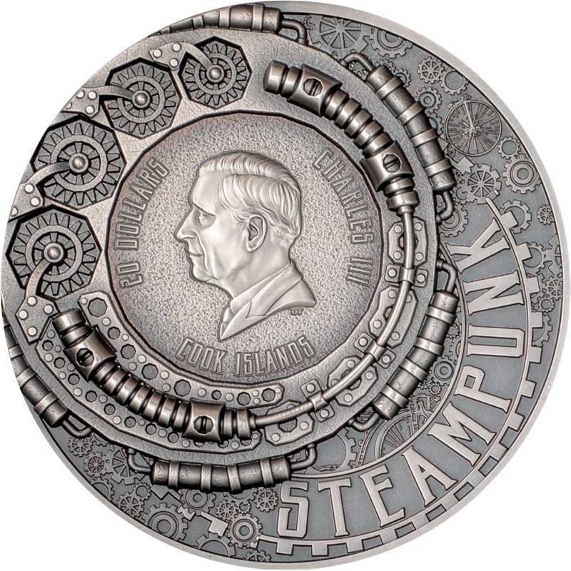 На аверсе на фоне шестеренок и механизмов изображен Его Величество король Чарльз III. Внизу портрета инициалы дизайнера TD (Dan Thorne). Вокруг портрета надпись: 20 DOLLARS CHARLES III COOK ISLANDS (номинал, Чарльз III, страна-эмитент). Справа – название серии –STEAMPUNK.