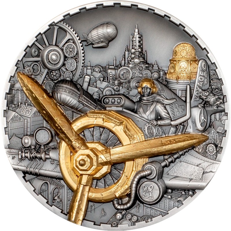 На реверсе детально изображен моноплан с открытой кабиной и пилотом, окруженный элементами индустриального пейзажа: шестеренками, зданиями в стиле стимпанк и дирижаблями в небе. Слева, около лопасти пропеллера год чеканки — 2025.