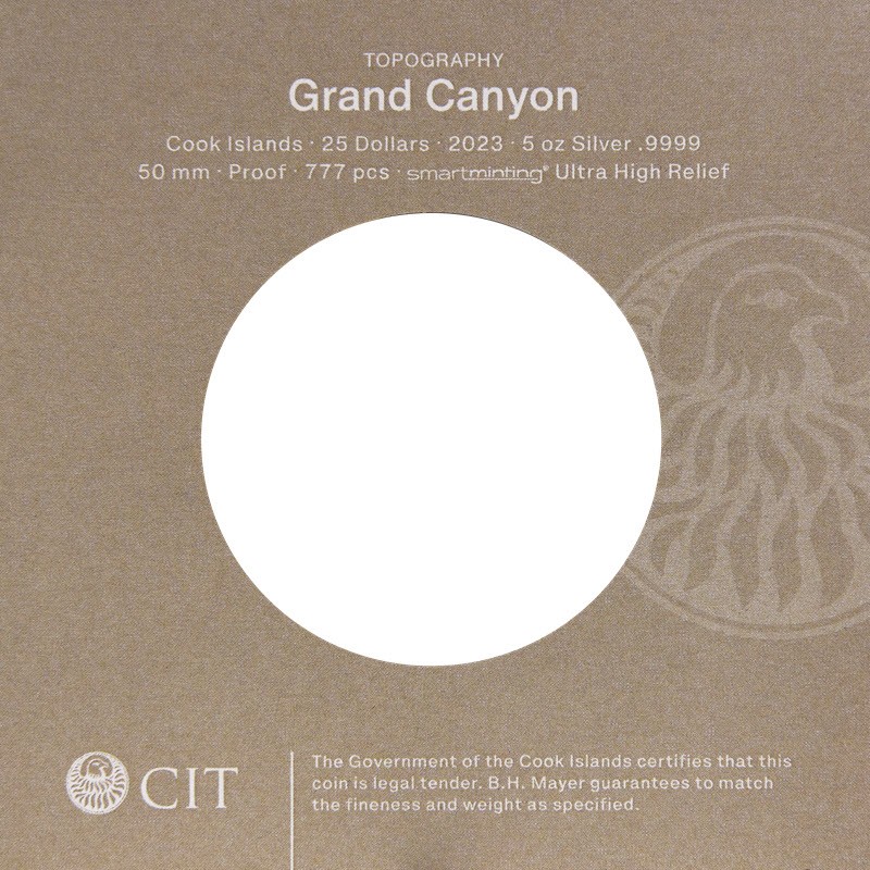 На реверсе монеты изображены удивительные сверхвысокие рельефы, выполненные с помощью технологии Smartminting, изображающие Гранд-Каньон, массивное геологическое образование, простирающееся на более чем 277 миль в северной Аризоне. Техника чеканки, кажется, воссоздает эффект Большого Каньона, высеченного в скалах.