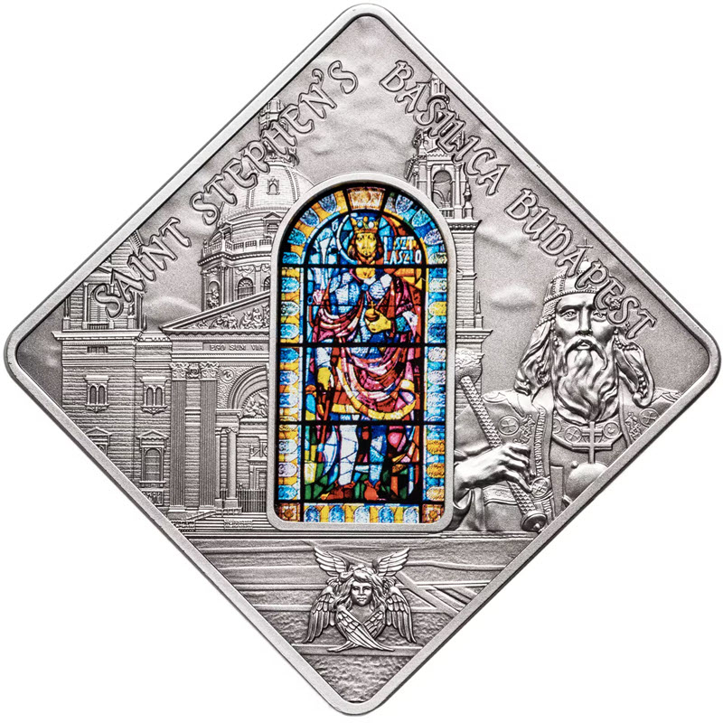 На реверсе изображен внешний вид базилики Святого Стефана с витражом Святого Ласло. Вверху надпись: SAINT STEPHEN'S BASILICA BUDAPEST.