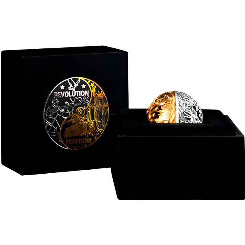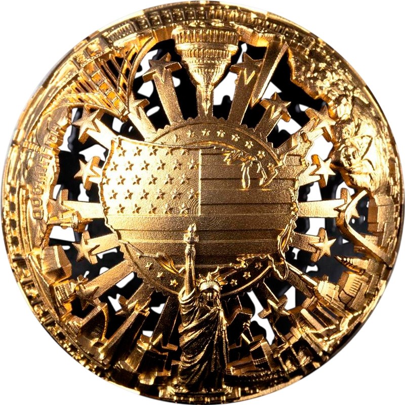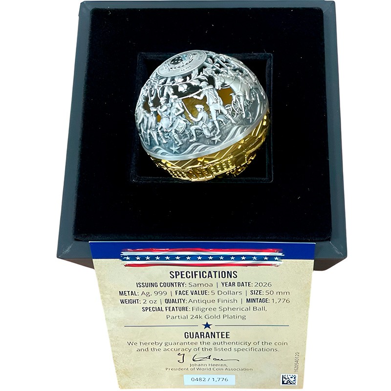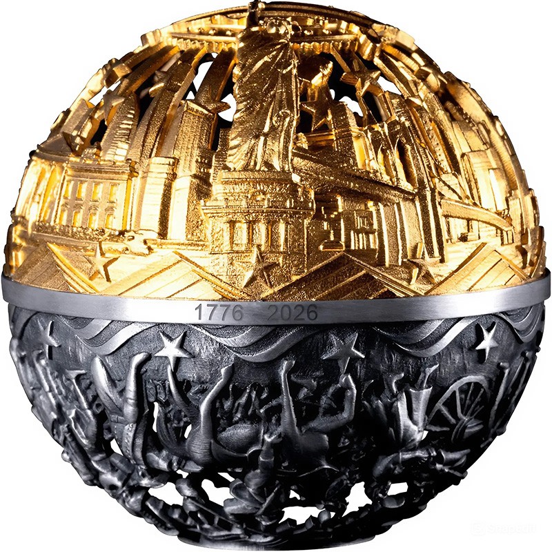 Эта чудесная 2-х унцовая серебряная монета, выполненная в форме полой сферы с использованием техники филиграни, посвящена 250-летию независимости США. Она символизирует путь Америки от борьбы за свободу до процветания - дизайн построен на контрасте двух исторических эпох: революция (серебряная полусфера) и свобода (золотая полусфера). Между двумя полусферами находятся юбилейные даты: 1776 – 2026.