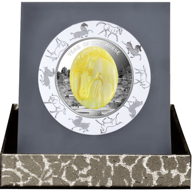 На реверсе на вставке из перламутра овальной формы рельефное изображение головы лошади. Вверху надпись: YEAR OF THE HORSE (Год Лошади), внизу: 2026 (год чеканки).