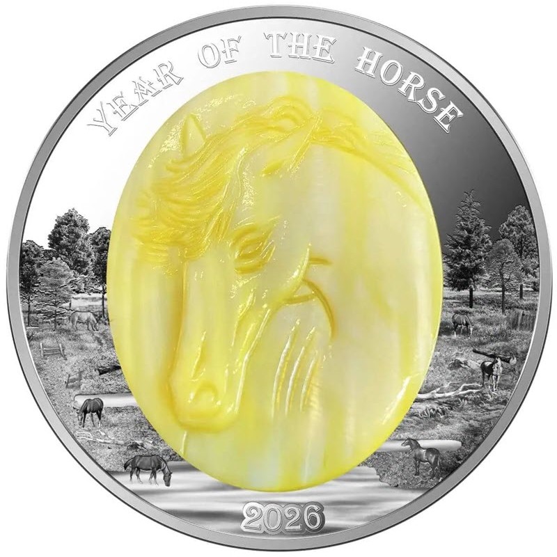 На реверсе на вставке из перламутра овальной формы рельефное изображение головы лошади. Вверху надпись: YEAR OF THE HORSE (Год Лошади), внизу: 2026 (год чеканки).