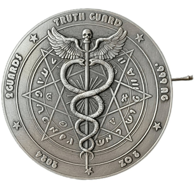 На аверсе изображен герб Стражей Истины. Вдоль канта надпись: TRUTH GUARD * 2 GUARDS * 2024 * 2 OZ * .999 AG * (эмитент, номинал, год чеканки, вес и проба серебра).
