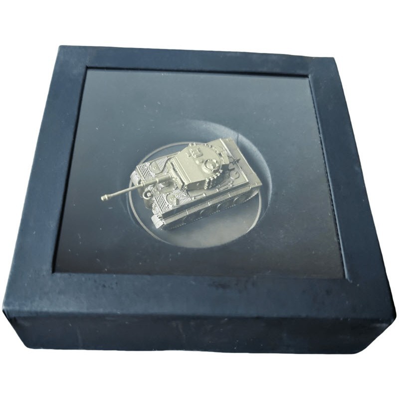 Эта серебряная монета весом в 2 унции изображает танк PzKpfw VI Tiger. У нее 3D-форма в масштабе 1:144 с вращающейся башней и качеством античной отделки. Поставляется в оригинальном футляре с сертификатом подлинности. Тираж: 199 штук.
