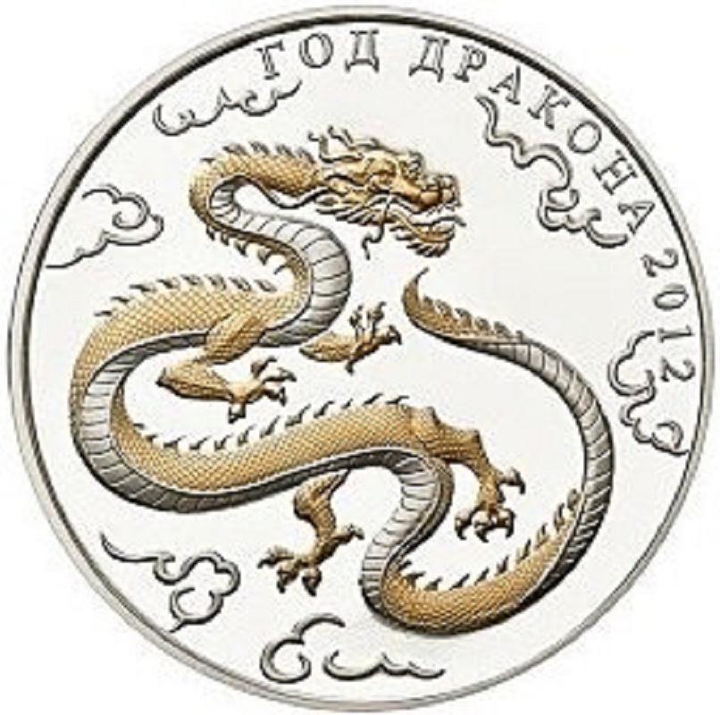Позолоченное изображение китайского дракона. Сверху надпись на русском языке — Год Дракона 2012