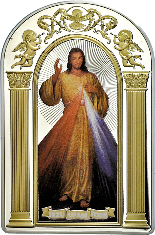 На реверсе изображена репродукция картины Адольфа Хила «Божественная милость». Внизу надпись: JEZU UFAM TOBIE (Иисус, я верю в Тебя).
