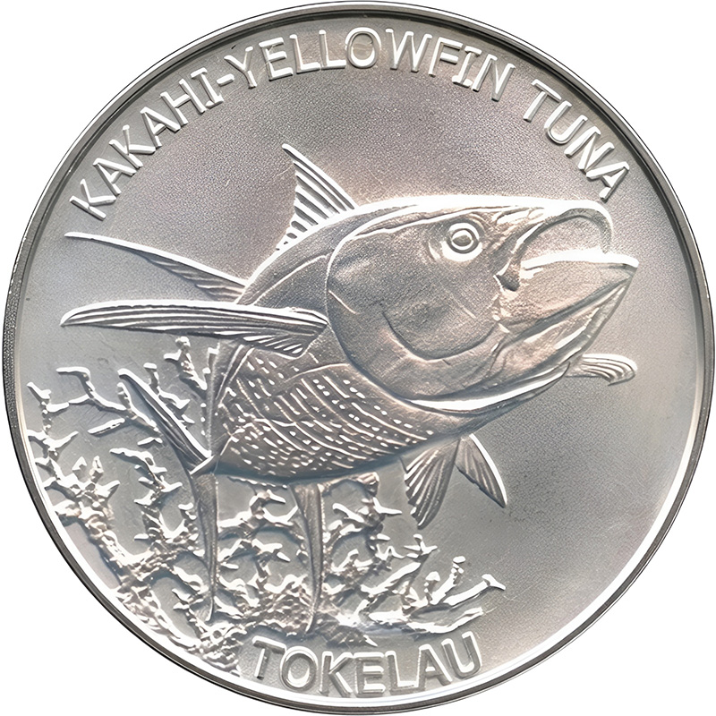 На реверсе изображен желтопёрый тунец на фоне водорослей. По ободу полукругом надписи: вверху — «KAKAHI-YELLOWFIN TUNA» (Желтоперый тунец), внизу — TOKELAU (страна-эмитент).
