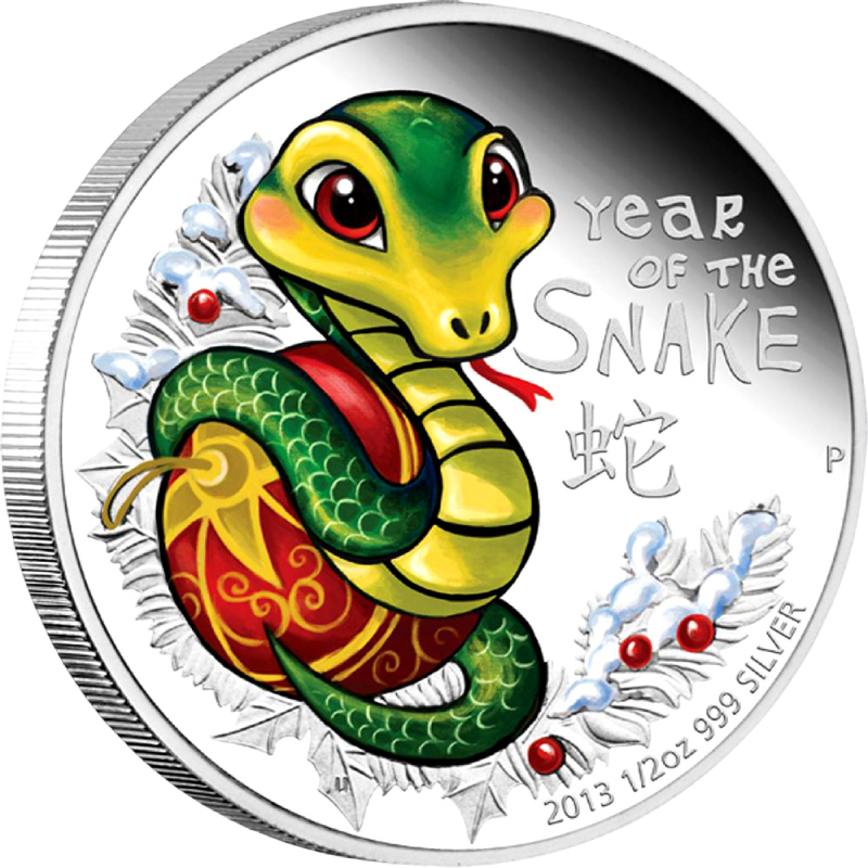 На реверсе - цветное изображение детеныша змеи на веточке рождественской ёлки, обвивающего новогодний шар. В центре надпись: YEAR OF THE SNAKE (Год Змеи) и китайский иероглиф, обозначающий змею. Внизу справа надписи: 2013 1/2oz 999 Silver (год чеканки, вес и проба серебра), Р (знак Пертского монетного двора).