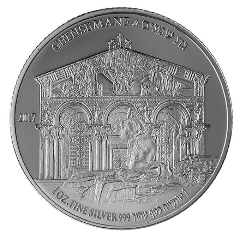 Иисус молится перед Церковью Всех Наций. Надпись: Гефсиманский на английском и иврите, 1 унция. я. Fine Silver .999