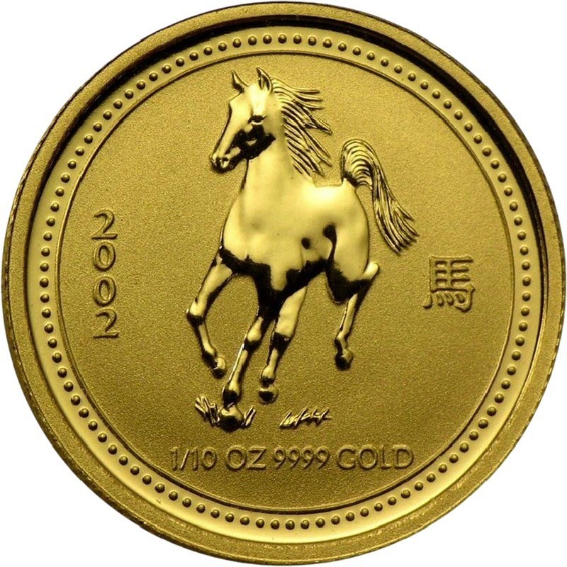 На реверсе изображена скачущая лошадь, символизирующая энергию, силу и грацию. Слева надпись: 2002 (год чеканки), справа: 馬 (Год Лошади), внизу:  1/10 OZ 9999 GOLD (вес и проба золота).
