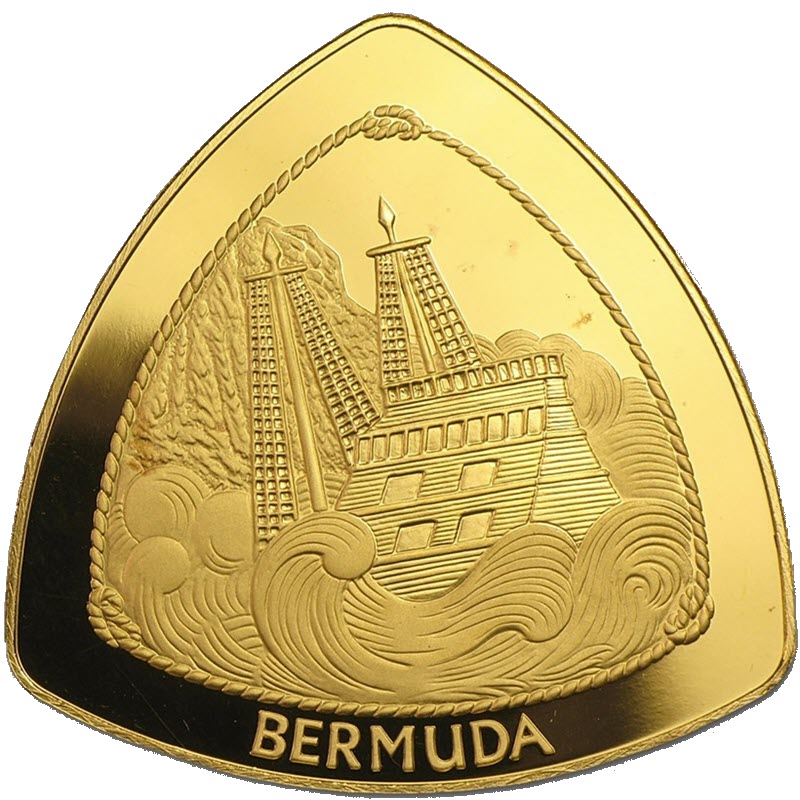 Золотая монета серии «Бермудский треугольник».  Монета треугольной формы.
