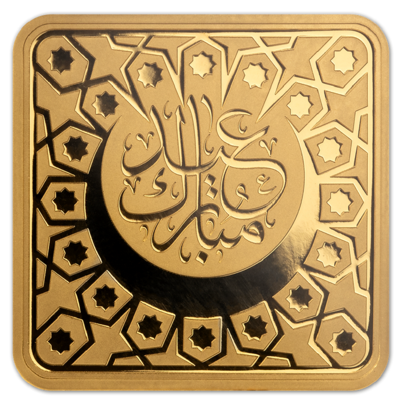 На реверсе этой изящной и многозначительной монеты арабской каллиграфией выведены слова "Ид Мубарак", что означает "Благословенный Ид". В месяц Рамадан мусульмане постятся от рассвета до заката каждый день. Ид аль-Фитр знаменует окончание поста и является для мусульман временем, когда они собираются вместе с семьей и друзьями, чтобы отпраздновать и поблагодарить за силу и терпение, которые они проявили во время Рамадана.