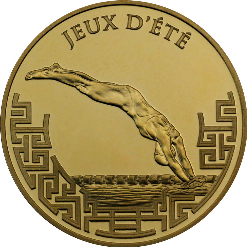 На аверсе монеты изображен прыгнувший в воду спортсмен. Снизу по канту полукругом помещен орнамент. Вверху полукругом находится надпись: «JEUX D'ÉTÉ» (Летние игры).