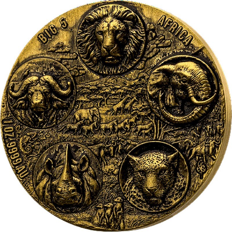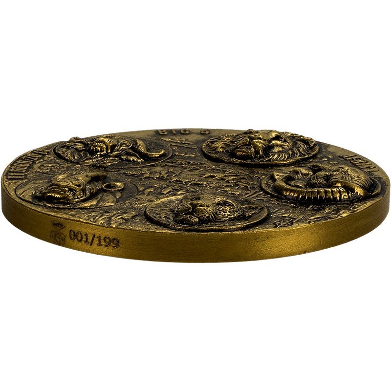 Дизайн этой золотой монеты из серии «Большая пятерка Африки» был реализован монетным двором П. де Грефа. У нее невероятный горельеф и античная отделка. Она завершает серию и содержит всех животных серии: лев, слон, леопард, носорог и буйвол. Поставляется в роскошном деревянном футляре с сертификатом подлинности. Тираж: 199 штук.