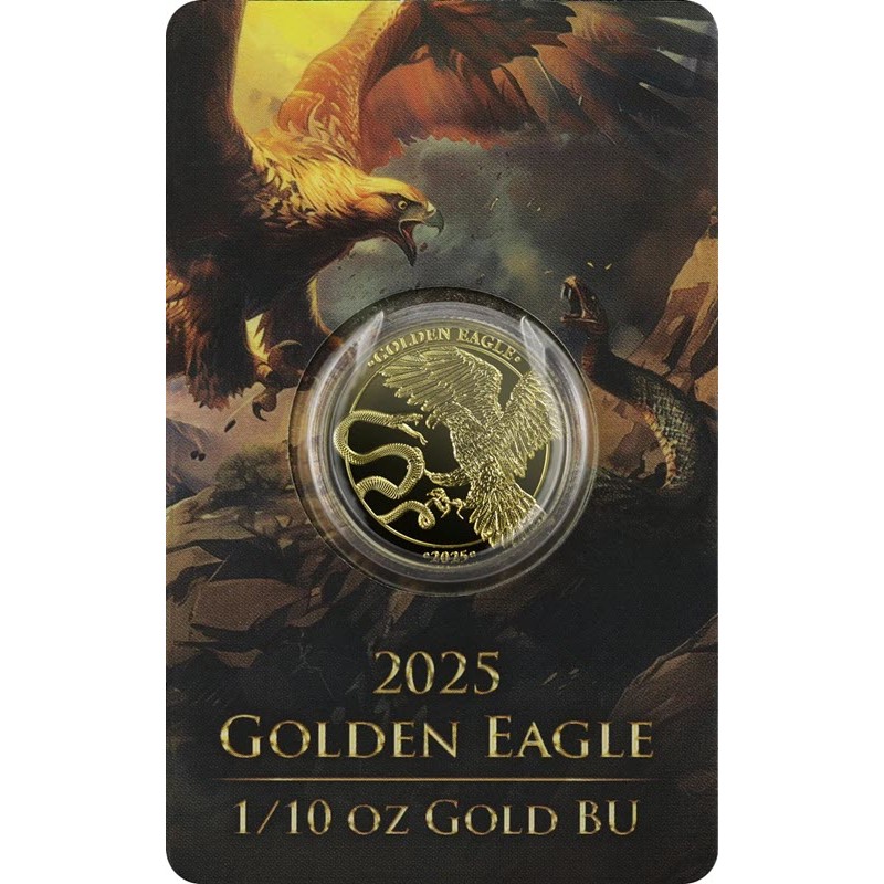 На реверсе изображена битва мощного Орла с опасным и злобным Змием на фоне стилизованных морских вод Средиземноморья. Вверху вдоль канта надпись: • GOLDEN EAGLE • , внизу: • 2025 • (год чеканки).