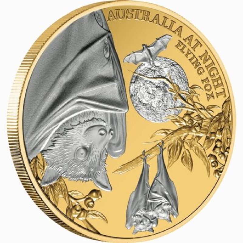 На реверсе монеты изображено красивое изображение летучих мышей, называемых летучими лисами, свисающих с дерева. Эта трудолюбивая летучая мышь вносит свой вклад, обеспечивая опыление, распространяя пыльцу и семена на большие расстояния. На фоне изображение полной луны. Вверху реверса надписи: «AUSTRALIA AT NIGHT» — название серии и «FLYING FOX» — название монеты.