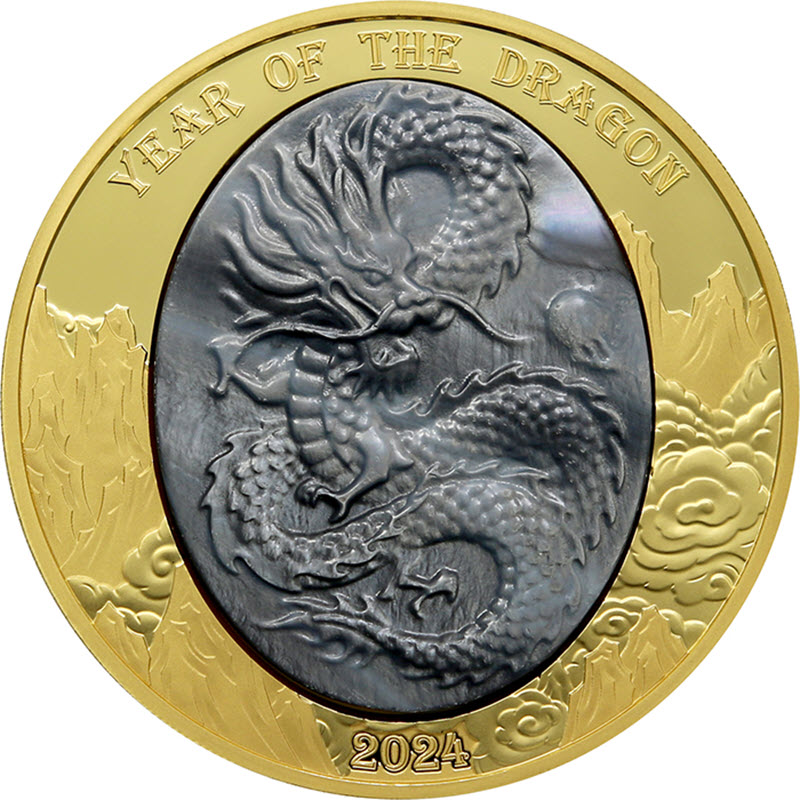 Эта монета из серии «Перламутр». Монета весом 5 унций (155,5 г) из золота пробы 999 с инкрустацией из натурального перламутра овальной формы размером 40 х 50 мм. Перламутр получают из раковин самого крупного в мире морского жемчуга - Pinctada Maxima. Отбор самых красивых жемчужных ракушек занимает до 12 недель. Затем с помощью ультразвуковых волн создается дизайн дракона. Для достижения необходимого цвета перламутр замачивают в ванне еще 5 недель. Монета помещена в пластину из хрусталя и поставляется в оригинальном футляре с номерным сертификатом подлинности. Тираж: 25 штук.