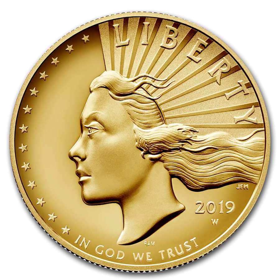 Золотая монета США «Свобода» 2019 года выпуска выполнена в высоком рельефе с применением электронной технологии Монетным двором США. Изображения на обеих сторонах монет посвящены идеалам свободы и мужества.