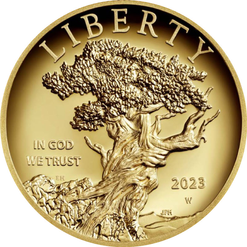 На аверсе изображена щетинистая сосна, вид, произрастающий в Калифорнии, Неваде и Юте, который считается старейшим живым организмом на Земле, живущим до 5000 лет. Щетинистые сосны растут там, где другие растения не могут этого сделать, и часто являются первыми видами, которые заселяют землю после катастрофических изменений, таких как поток лавы или ледниковый сток. Надписи: «LIBERTY», «IN GOD WE TRUST» и «2023».