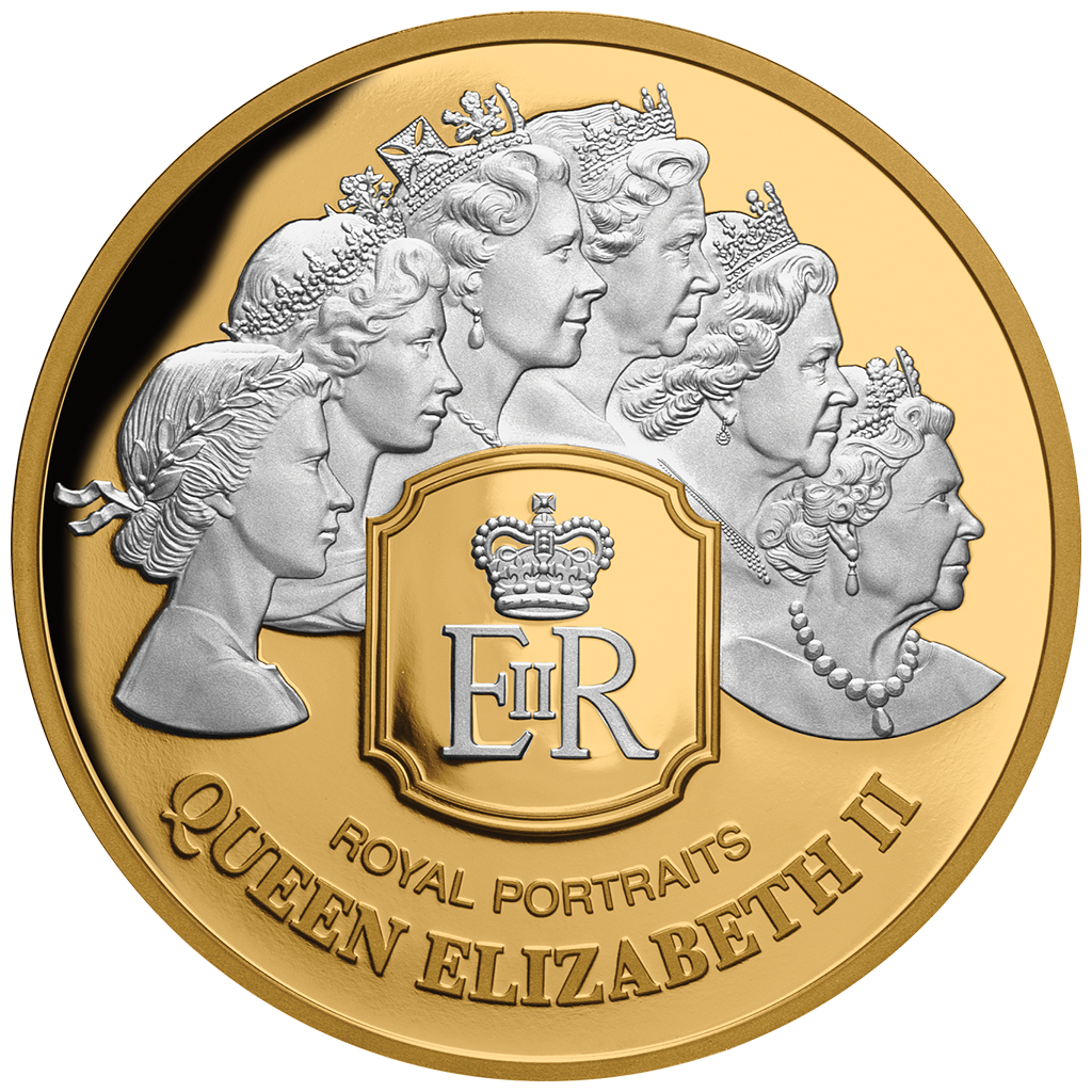 Шесть портретов Королевы, объединенные с ее личной Королевской Монограммой.(Портреты Мэри Гиллик (1953-64), Арнольда Мачина (1966-84), Рафаэля Маклуфа (1985-98), Яна Рэнк-Бродли (1999-2019), Владимира Готвальда (2000) и Джоди Кларка (2019-).)