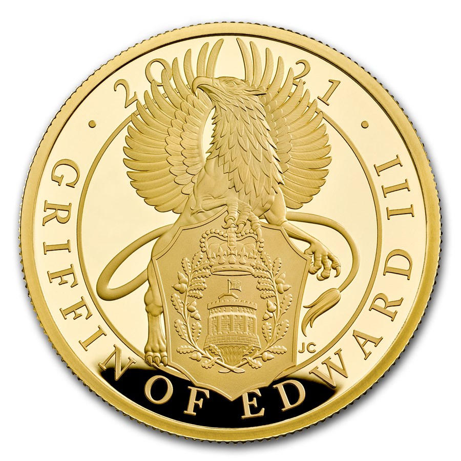 На аверсе монеты "Грифон" - портрет Ее Величества Королевы Елизаветы II, выполненный Джоди Кларком, представленный на британских монетах с 2015 года (так называемый пятый тип монетного портрета королевы). По краю монеты расположены надписи, указывающие номинал монеты и имя Королевы: 100 POUNDS / ELIZABETH II / D / G / REG / F / D.