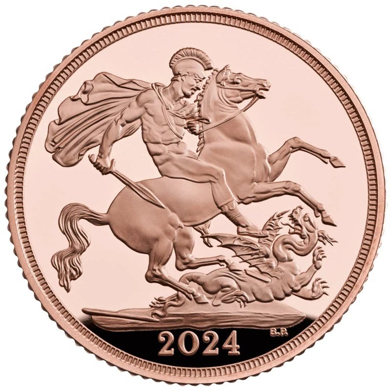 На реверсе классическое изображение Святого Георгия и дракона от Бенедетто Пиструччи. Внизу справа инициалы дизайнера B.P. (Benedetto Pistrucci), ниже: 2024 (год чеканки).