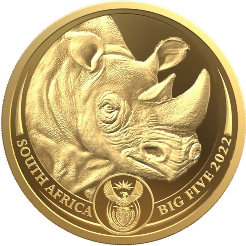 На реверсе монеты изображено красивое и детальное изображение носорога. Надписи «SOUTH AFRICA», «BIG FIVE 2022» и герб ЮАР также являются частью дизайна.