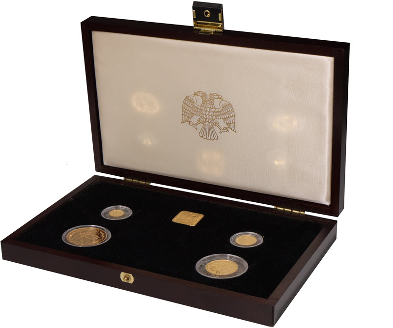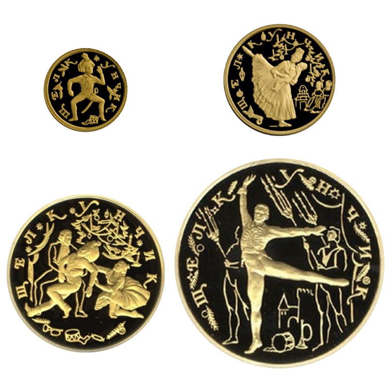 Набор из 4-х золотых монет России «Балет «Щелкунчик»» из серии «Русский балет» качества пруф 1996 года от Ленинградского монетного двора. Поставляется в оригинальном футляре с позолоченным жетоном и сертификатом подлинности. Тираж: 2500 штук.