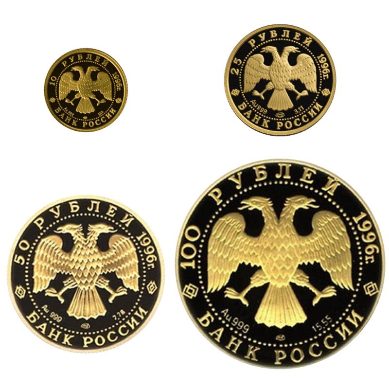 На аверсе всех монет изображен герб Банка России (двуглавый орел с опущенными крыльями). Под ним надпись: Au 999 ЛМД ХХХ (вес и проба золота, монограмма Ленинградского монетного двора). Вверху вдоль канта надпись: ХХХ РУБЛЕЙ 1996 г. (номинал, год чеканки), внизу: БАНК РОССИИ.