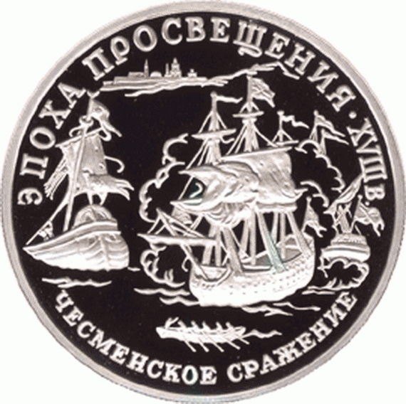 Платиновая монета России «Чесменское сражение» 1992 года выпуска является частью серии «Эпоха Просвещения» и посвящена крупному морскому сражению русско-турецкой войны 1768-1774 гг. В результате победы в этом сражении России получила контроль над Эгейским морем и Дарданеллами.