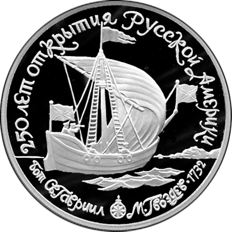 На реверсе изображен бот «Святой Гавриил». Вдоль канта надпись: 250 ЛЕТ ОТКРЫТИЯ РУССКОЙ АМЕРИКИ Бот Св. Гавриил М. Гвоздев∙1732.
