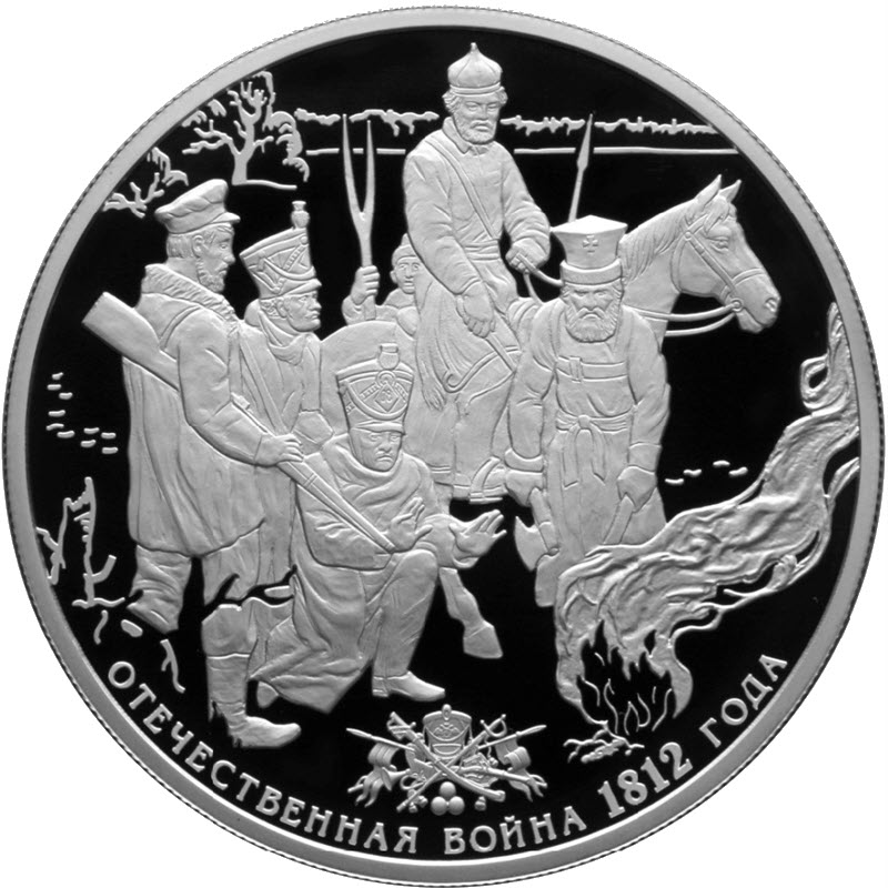 на зеркальном поле диска монеты - сцена из партизанского движения осени 1812 года: два пленных солдата, согревающихся у костра в окружении четырех партизан, вооруженных ружьем, топором и рогатиной, один из них верхом на лошади. Внизу - кивер над скрещенным оружием, штандартами и военной амуницией, под ними - надпись вдоль канта: "ОТЕЧЕСТВЕННАЯ ВОЙНА 1812 ГОДА".