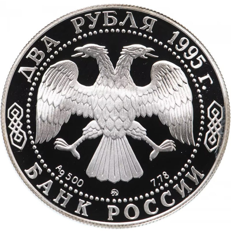 На аверсе изображена эмблема Банка России (двуглавый орел с опущенными крыльями), под ним надпись: Ag 500 ММД 7.78 (вес и проба серебра, монограмма Московского монетного двора). Вдоль канта надпись: ДВА  РУБЛЯ 1995 г. БАНК РОССИИ  (номинал, год чеканки, банк).