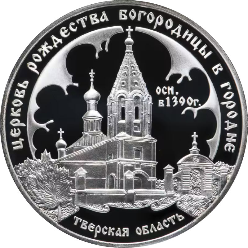 изображение архитектурного ансамбля церкви Рождества Богородицы, справа в две строки – надпись: «ОСН. в 1390 г.», по окружности – надписи: вверху – «ЦЕРКОВЬ РОЖДЕСТВА БОГОРОДИЦЫ В ГОРОДНЕ», внизу –«ТВЕРСКАЯ ОБЛАСТЬ».